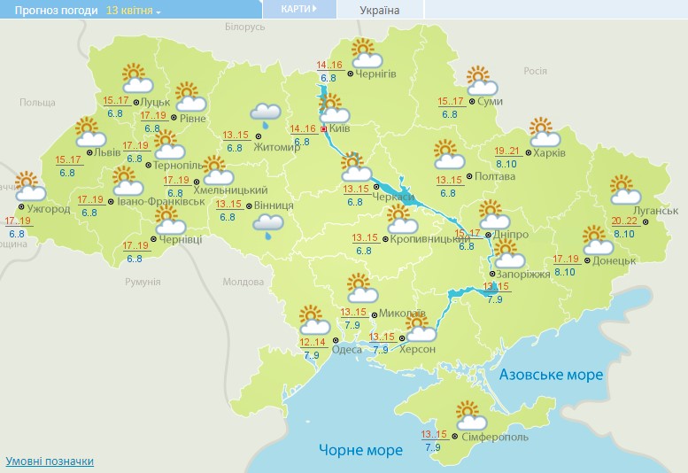 У вівторок, 13 квітня, температура повітря в Україні суттєво не зміниться, водночас на сході потеплішає ще більше – до +22. Невеликий дощ прогнозують лише в Житомирській та Вінницькій областях, на решті території – без опадів.