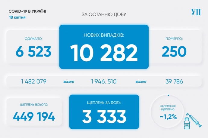 Протягом суботи, 17 квітня, в Україні виявили ще 10 282 випадки Covid, хвороба забрала життя 250 людей.