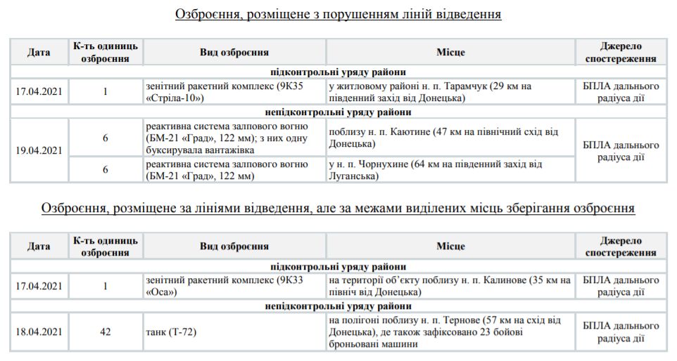 Дослівно: "Місія зафіксувала розміщені з порушенням ліній відведення 1 зенітний ракетний комплекс в житловому кварталі в підконтрольному урядові районі Донецької області, а також 12 реактивних систем залпового вогню: 6 (одну на буксирі перевозила вантажівка) поблизу н. п. Каютине (непідконтрольний урядові, 47 км на північний схід від Донецька) та 6 біля н. п. Чорнухине (непідконтрольний урядові, 64 км на південний захід від Луганська)".