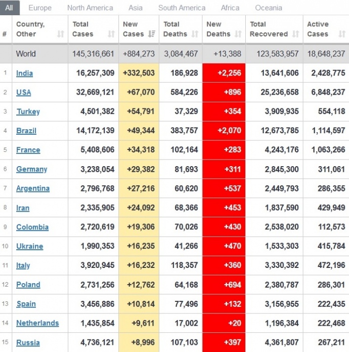 Деталі: Зокрема, в Індії зафіксували понад 332 тисячі нових інфікувань, у США – понад 67 тисяч, а у Туреччині – понад 54 тисячі випадків.