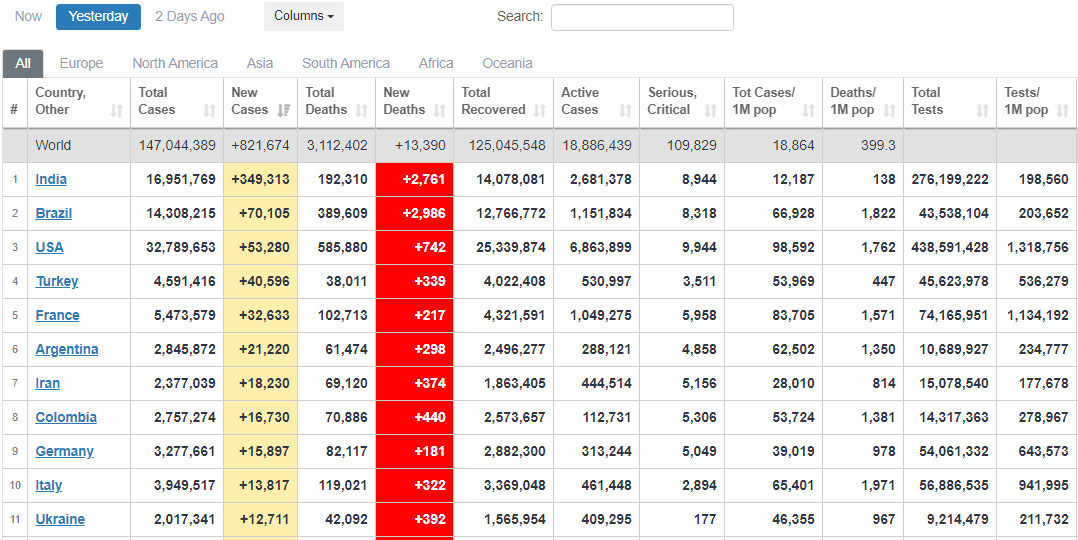 Деталі: Зокрема в Індії – 349 313 випадків, у Бразилії - 70 105, у США – 53 280.
