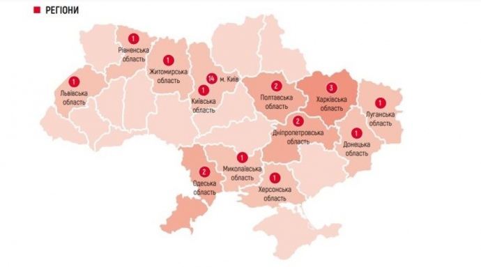На другому місці після Києва з кількості зафіксованих інцидентів – Харківська область (3), на третьому – Одещина і Полтавщина (по 2).
