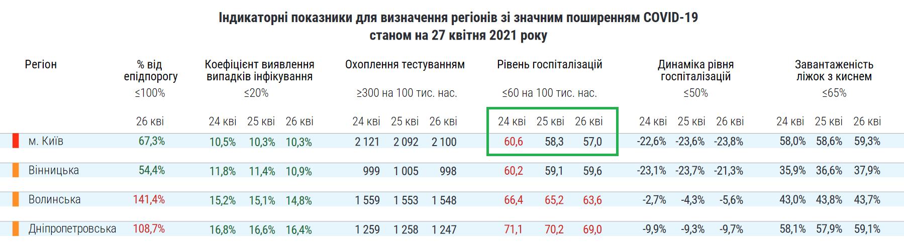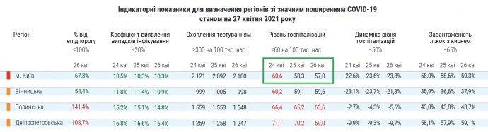 Деталі: Ще 24 квітня у Києві зашкалював рівень госпіталізацій ковідних хворих. При допустимому максимумі у 60 на 100 тисяч населення цей показник сягав 60,6, що робило його "червоним".