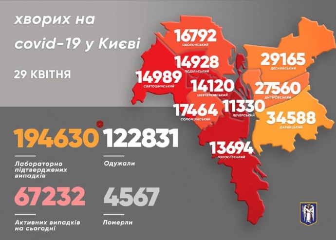 Загалом у Києві від початку пандемії зафіксовано 194 630 випадків коронавірусу, 4567 мешканців столиці померли, 122 831 киянин подолав коронавірус.