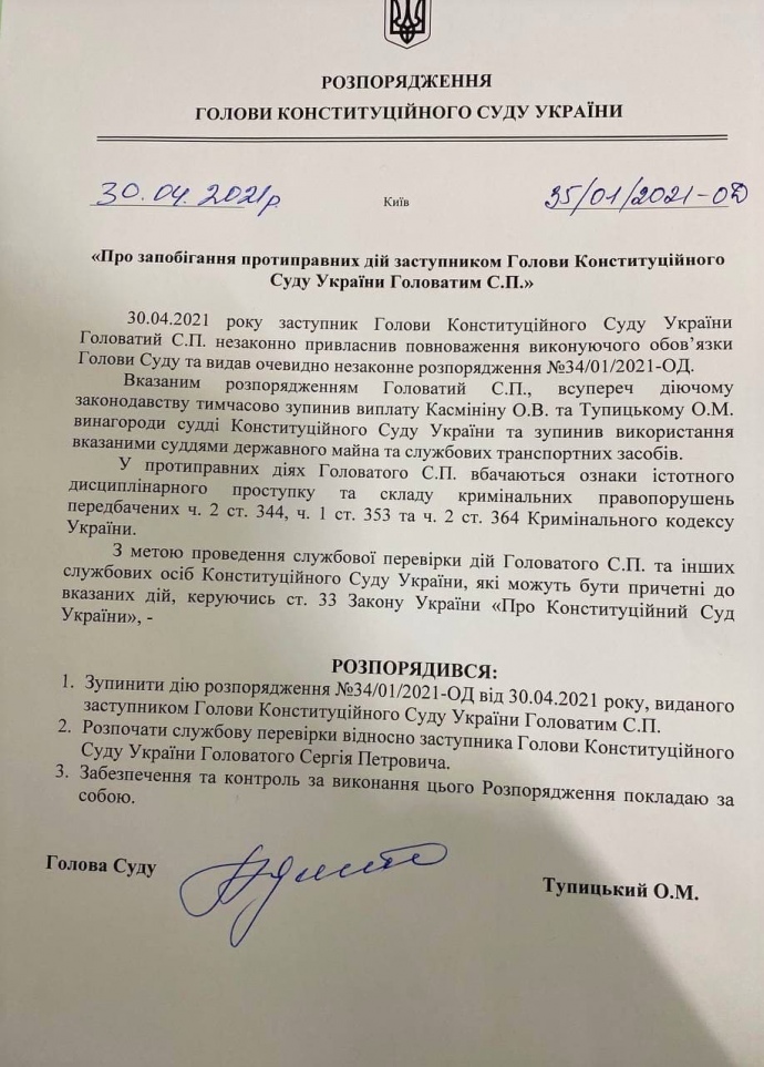 Деталі: У розпорядженні видання є документ, підписаний Головатим, від 30 квітня. Підставами для такого розпорядження в.о. голови КС визначив указ Зеленського, яким той скасував призначення Тупицького і Касмініна.