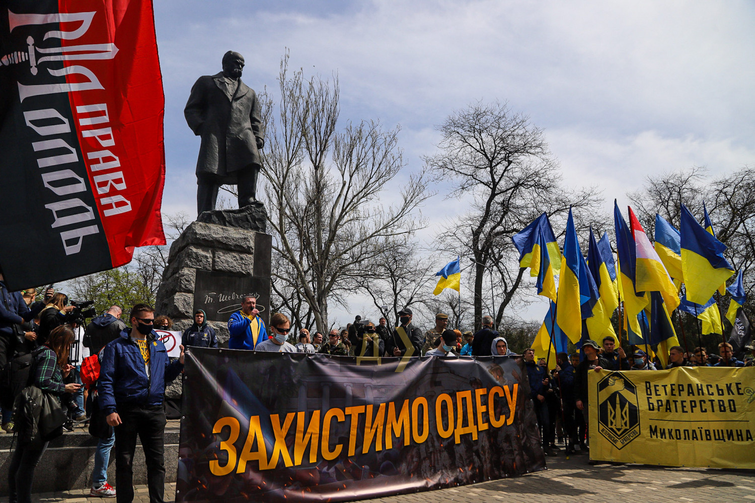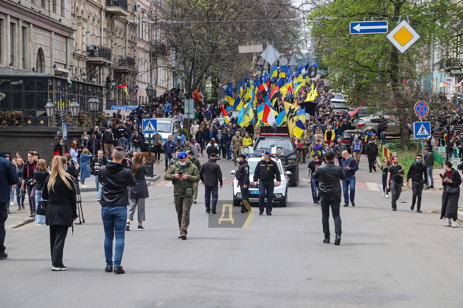 Після вшанування пам'яті загиблих хвилиною мовчання представники патріотичних сил міста, в тому числі ветерани АТО/ООС, активісти ГО "Національний корпус", "Свобода" та інших організацій вирушили колоною під державними прапорами центральними вулицями в напрямку пам'ятника Тарасу Шевченку, де відбувся мітинг проукраїнськи налаштованих одеситів.