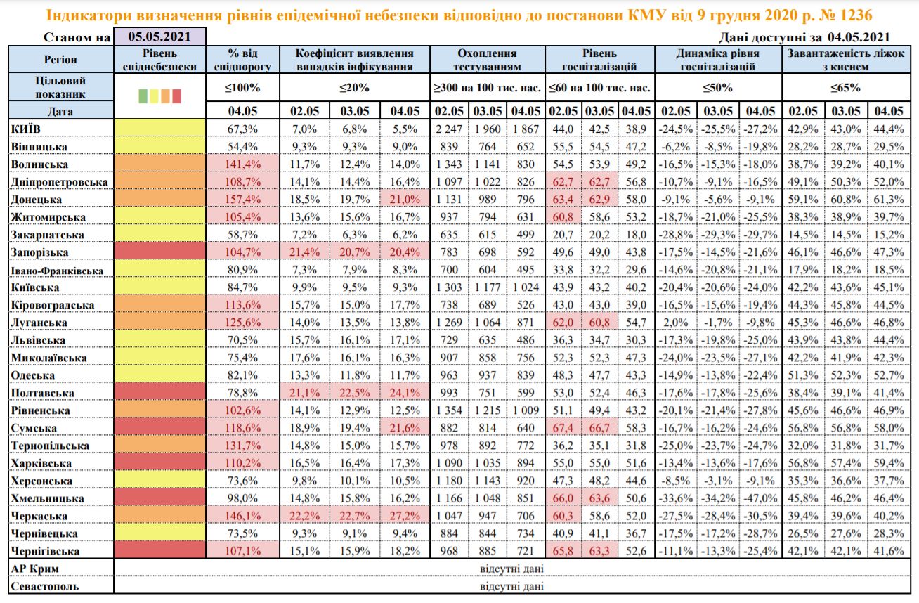 - Із 1 травня Київ, Київська та Миколаївська області перейшли із "червоної зони" епідемічної небезпеки до "жовтої". Житомирська, Запорізька, Полтавська, Сумська, Харківська, Хмельницька і Чернігівська області залишалися в "червоній" зоні.