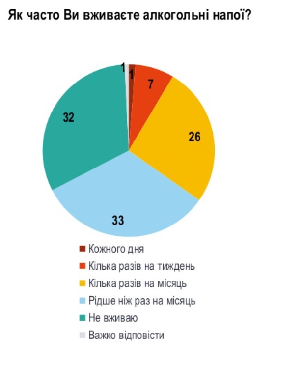 Дослівно: "66% опитаних українців вживають алкогольні напої. 33% вживають його рідше, ніж раз на місяць, 26% - кілька разів на місяць, 7% - кілька разів на тиждень, 1% - кожного дня.