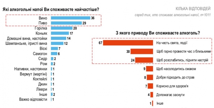 Горілку вживають 20%, коньяк – 17%, домашні вина, настойки – 14%, шампанське, ігристі вина – 12%, віскі – 7%, самогон – 6%. Такі напої як сидр, ром, наливки чи настоянки, вермут, коктейлі, джин, лікери вживають 1-2%.