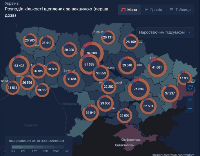 Деталі: Від початку вакцинальної кампанії 882 621 людину щеплено, з них першу дозу отримали 882 619 осіб, завершили вакцинацію 1 928 осіб (днем раніше таких було 695 осіб).