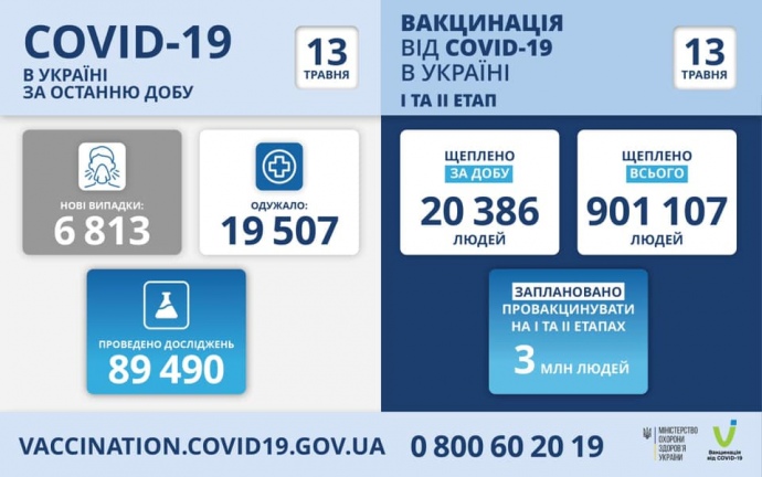 За добу 12 травня в Україні зафіксували 6 813 нових випадків коронавірусної хвороби COVID-19, госпіталізували 2 569 осіб, померли 346 хворих, одужали 19 507 осіб;