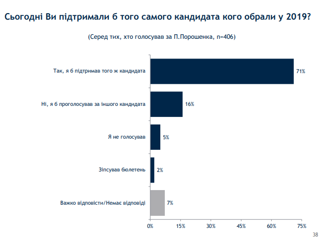 Залишається "вірним" Порошенку 71% його електорату. Водночас, 16% кажуть, що проголосували б за іншого кандидата, ще 5% – не голосували б, 2% – зіпсували, також 7% не змогли відповісти на запитання.