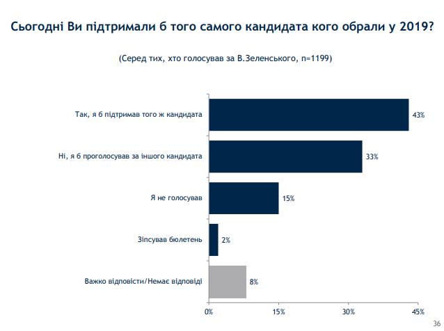 Деталі: Зокрема, серед тих, хто у другому турі підтримав кандидата Володимира Зеленського, вже 33% підтримали б іншого кандидата, 15% – не голосували б взагалі, 2% – зіпсували б бюлетень. Також 8% серед тих, хто підтримував Зеленського не змогли відповісти на запитання, чи підтримали вони б знову Зеленського. Таким чином серед тих, хто раніше підтримував Зеленського, 58% не зробили б цього вдруге.