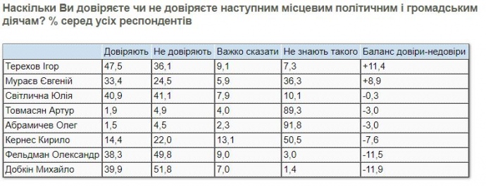 Так, Терехову довіряють 47% опитаних. Баланс його довіри-недовіри плюсовий і складає більше 11%.