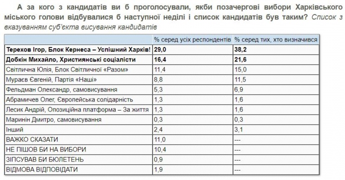 За результами опитування серед харків'ян наступним мером вони бачать представника партії покійного мера Геннадія Кернеса - секретаря міськради, який наразі виконує обов'язки міського голови, Ігоря Терехова.