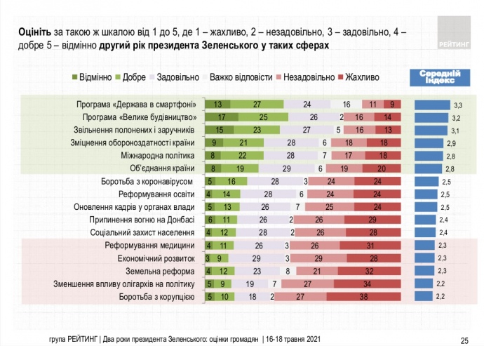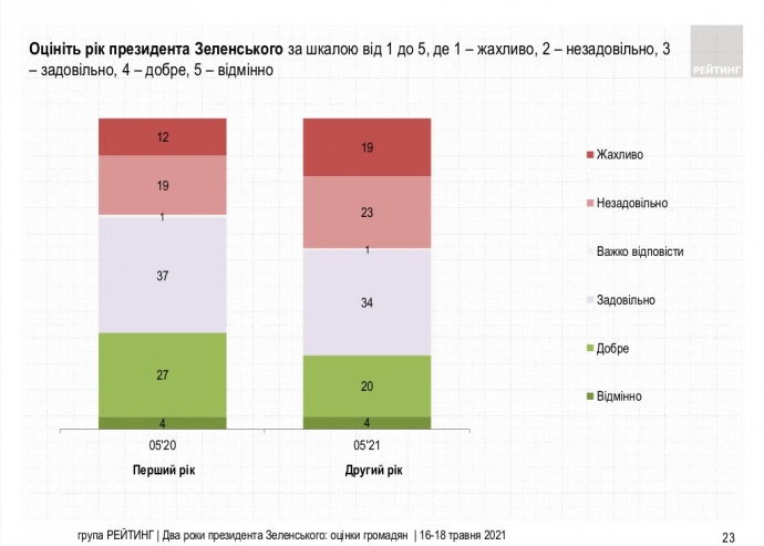 Дослівно: "Чверть опитаних оцінюють другий рік правління президента Зеленського на відмінно або добре, 34% – задовільно, 42% – незадовільно або жахливо".