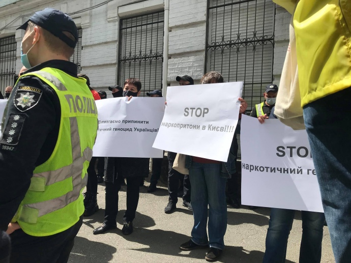 По інший бік від протестувальників стоїть до 20 їхніх опонентів. Це переважно жінки з надрукованими плакатами "Стоп наркопритони в Києві".
