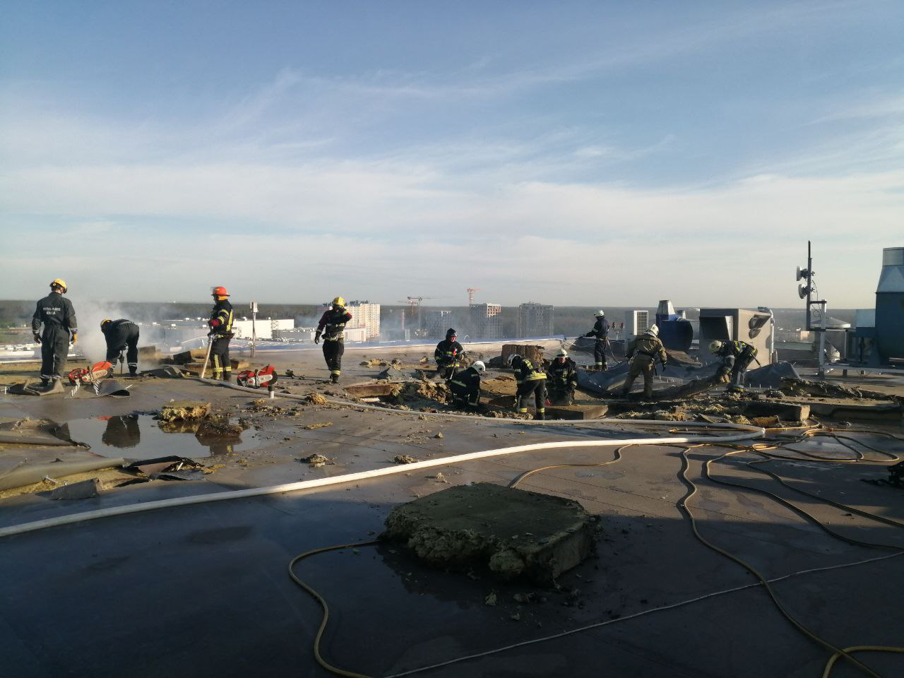 Зазначається, що гасіння ускладнювалося високою температурою та щільним задимленням. Рятувальники проводять розбір конструкцій.