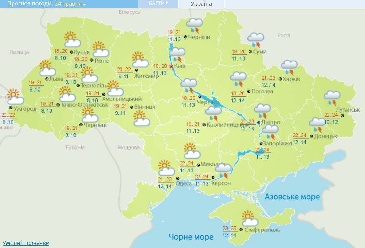 У неділю, 23 травня, у більшості регіонів Україні очікується сонячна погода й пригріє до +25°, короткочасні дощі можливі місцями у західних областях та на півночі. Але з понеділка країну накриє циклон з сильними опадами й поривчастим вітром.