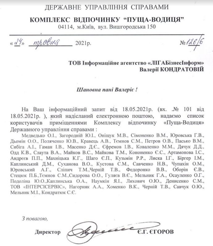У будинку відпочинку Пуща-Водиця проживають до 50 орендарів. Опубліковано їх повний список станом на 18 травня 2021 року.