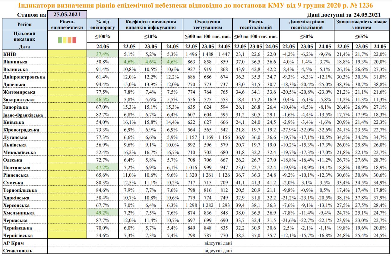 Прем’єр-міністр Денис Шмигаль 24 травня заявив, що в Україні дев'ятий тиждень поспіль покращуються всі епідемічні показники – і "вся Україна перебуває у "жовтій" зоні".