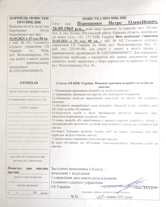 Дослівно: "Порошенко не з’явився на допит в СБУ. Його викликали у якості свідка у кримінальному провадженні за підозрою Віктора Медведчука і Тараса Козака у вчиненні кримінальних правопорушень, передбачених ч. 1 ст. 111, ч. 3 ст. 15 і ч. 1 ст. 438 КК України".