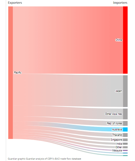 Деталі: Зокрема, у 2019 році Китай імпортував з Тихого океану 4,8 млн тонн мінеральних продуктів, 72 тисяч тонн морепродуктів і 4,8 млн тонн деревини. Папуа-Нова Гвінея, Соломонові Острови, Вануату, Тонга і Палау регулярно відправляють більше 90% свого експорту деревини в Китай. За вагою Соломонові Острови відправляють до Китаю майже всі свої мінеральні продукти, більшу частину яких становить алюмінієва руда.