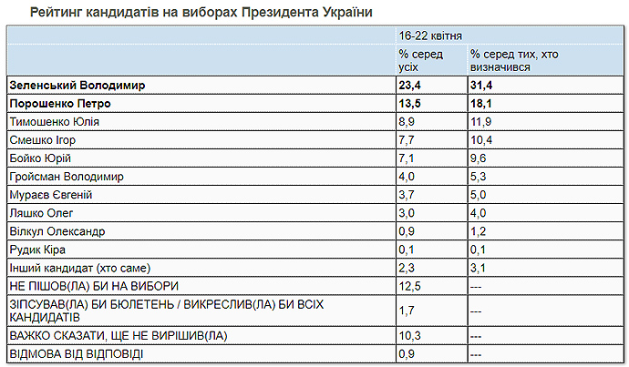 Дослівно: "Найбільшу підтримку отримав би Володимир Зеленський – 31,4% серед тих, хто збирається голосувати і визначився з вибором. На другому місці – Петро Порошенко, якого підтримали б 18,1% серед тих, хто визначився".