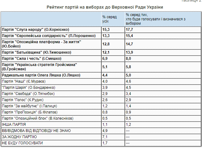 Деталі: Окрім чотирьох основних партій, які, згідно з рейтингами, весь час проходять ("Слуга народу", "Європейська солідарність", ОПЗЖ, "Батьківщина"), набирають не менше 5% такі партії, як "Сила і честь" (серед усіх 6,9% і серед тих, хто визначився з вибором і голосуватиме 8%), "Українська стратегія Гройсмана" (5,1% і 5,8%) і РПЛ (4,4% і 5%).