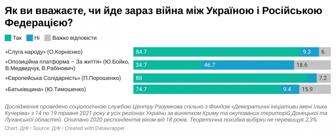 З цим погоджується абсолютна більшість виборців Володимира Зеленського (85%), Петра Порошенка (88%), Юлії Тимошенко (76%). Серед виборців Юрія Бойка тільки 31% погоджуються з цим твердженням, тоді як 50% його прихильників не згодні, що між Росією та Україною йде війна.