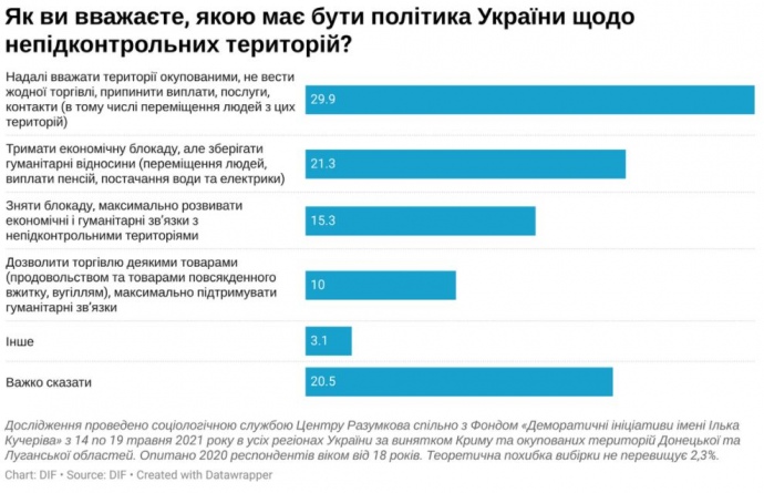 Так, 30% вважають, що території варто і надалі вважати окупованими, не вести з ними жодної торгівлі, припинити виплати, надання послуг і переміщення людей".