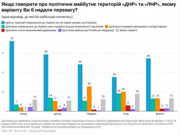 По 13% виступають за повернення цих територій на умовах автономії або іншої форми більшої незалежності від Києва.