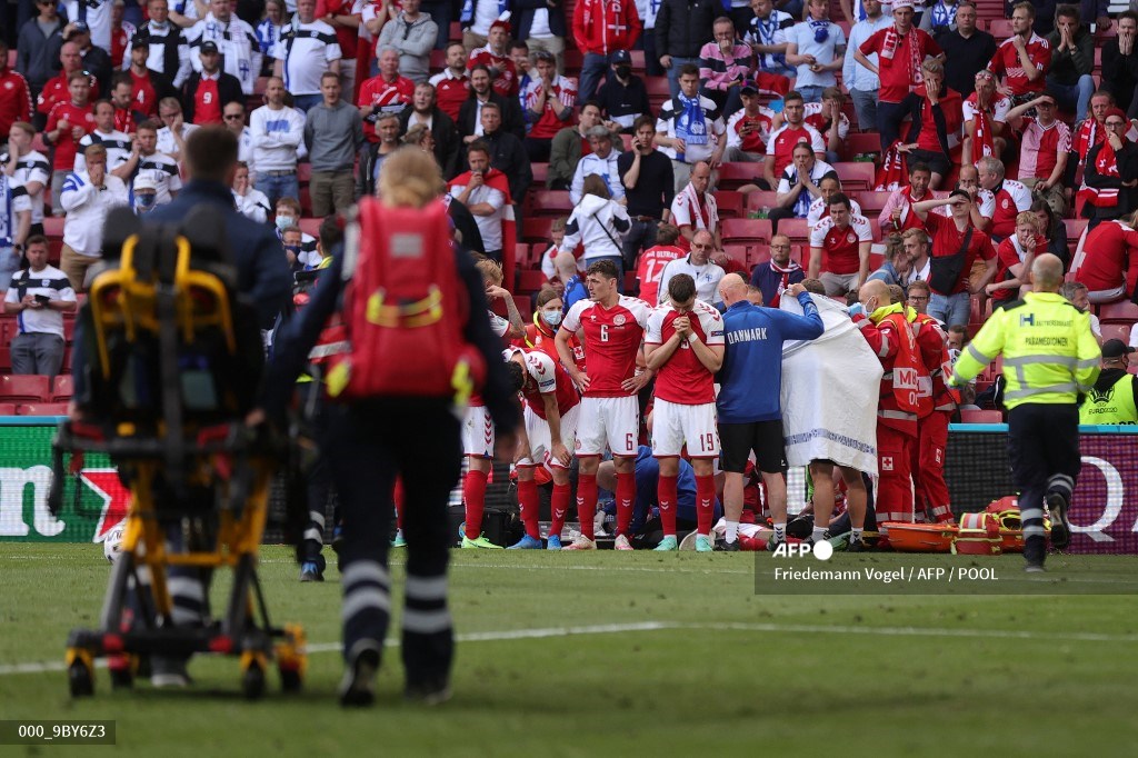 В кінці першого тайму гри Еріксен впав на газон непритомний, через що матч призупинили. Коли футболіст впав, його щільно обступили партнери по команді, щоб захистити від телекамер.