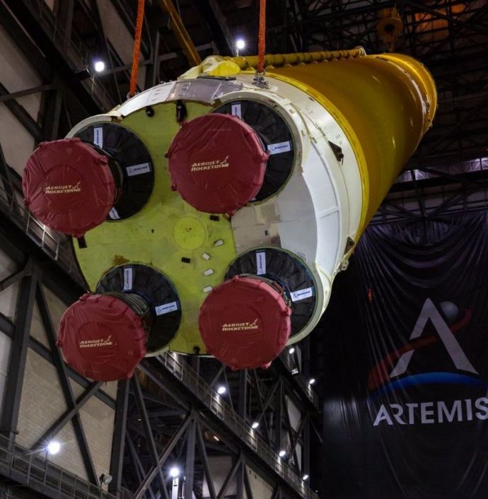 Деталі: Інженери Космічного центру Кеннеді у Флориді опустили 65-метровий основний ступінь ракети Space Launch System (SLS, Система космічного запуску) між двома прискорювачами, вперше поєднавши таким чином всі три основних елементи ракети.