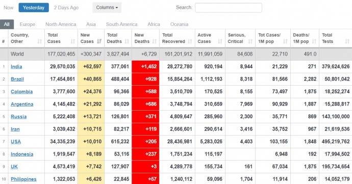 Крім того, в Аргентині – 21 292 випадки, а в Росії – 13 721.