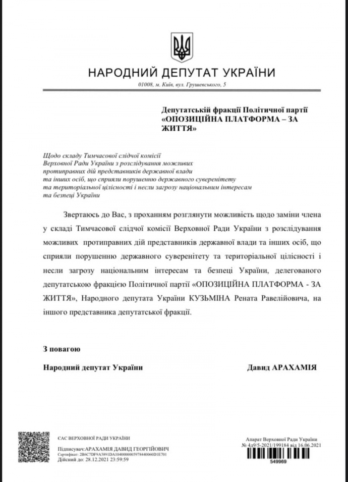 Глава фракції "Слуга народу" Давид Арахамія звернувся до "Опозиційної платформи – За життя" з проханням замінити нардепа Рената Кузьміна з Тимчасової слідчої комісії з розслідування можливих протиправних дій представників державної влади, що сприяли порушенню державного суверенітету та територіальної цілісності й несли загрозу націнтересам та безпеці.