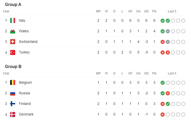 За результатами ігрового дня Італія підіймається на 1 місце у групі А, Вельс - друге місце цієї ж групи, Росія – на 2 місце у групі В.