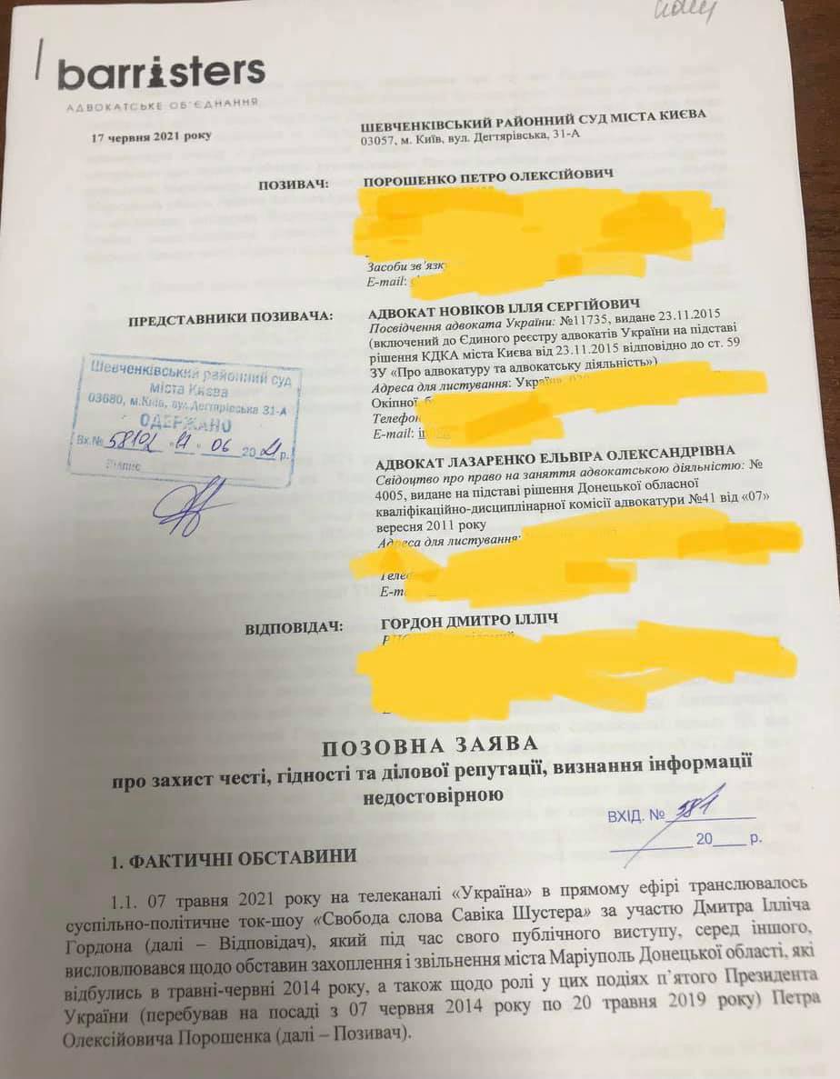 Адвокати від імені п’ятого президента Петра Порошенка подали до Шевченківського районного суду Києва позовну заяву проти журналіста Дмитра Гордона, вимагаючи визнати поширену інформацію недостовірною.