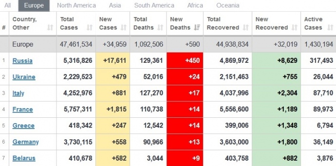 В Європі за поширенням коронавірусу лідирують Росія, Британія та Франція.