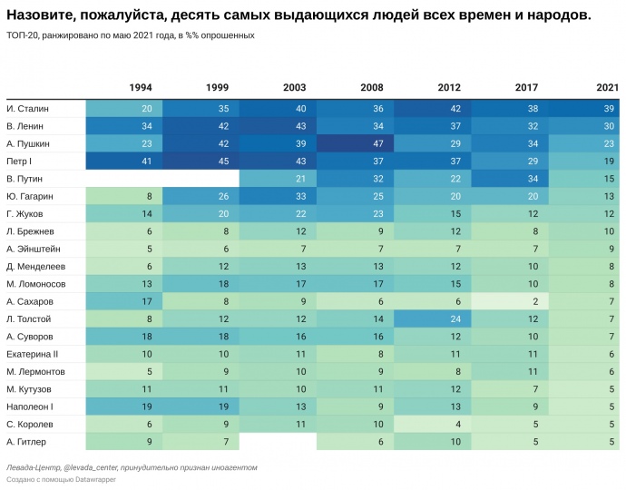 У травні 2021 року серед найвидатніших особистостей, на думку росіян, опинилися: Йосип Сталін (39%), Володимир Ленін (30%), Олександр Пушкін (23%), Петро I (19%) і Володимир Путін (15%).