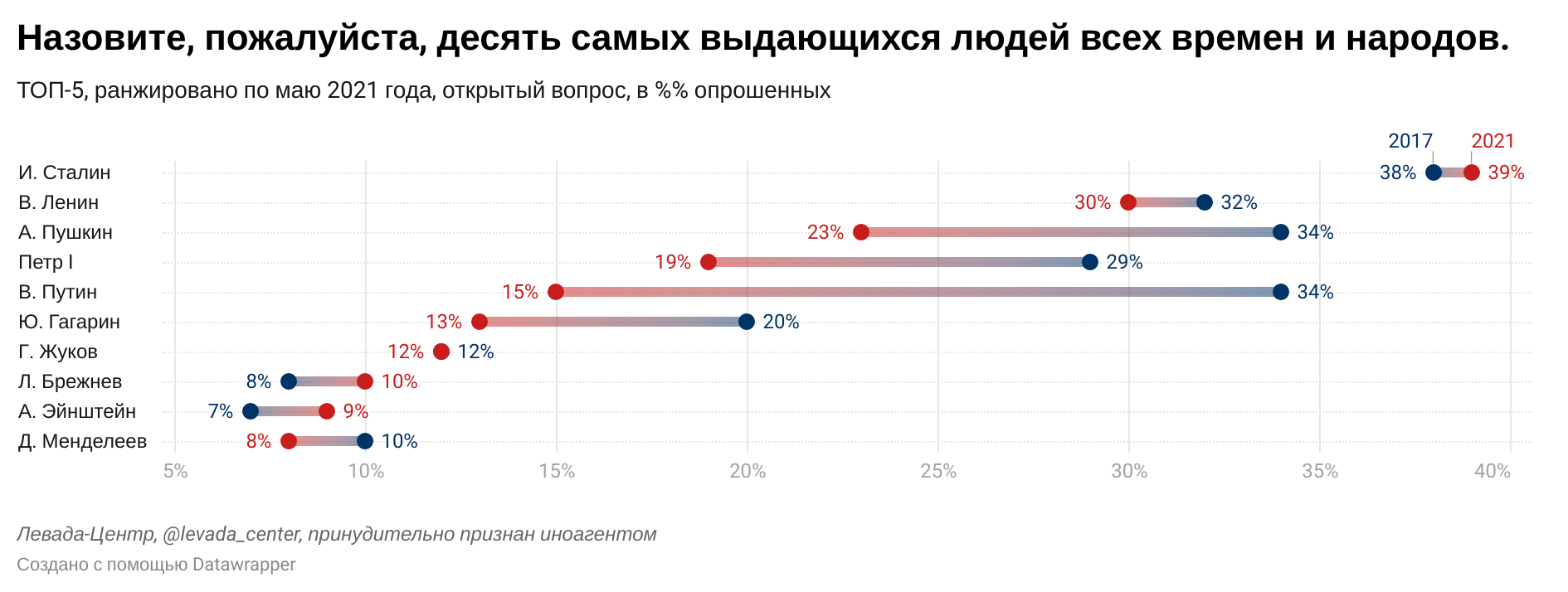Скоротилася і частка тих, хто називав Пушкіна: з 34% до 23%; і Петра I: c 29% до 19%. Сталін "утримує лідерство" з 2012 року.