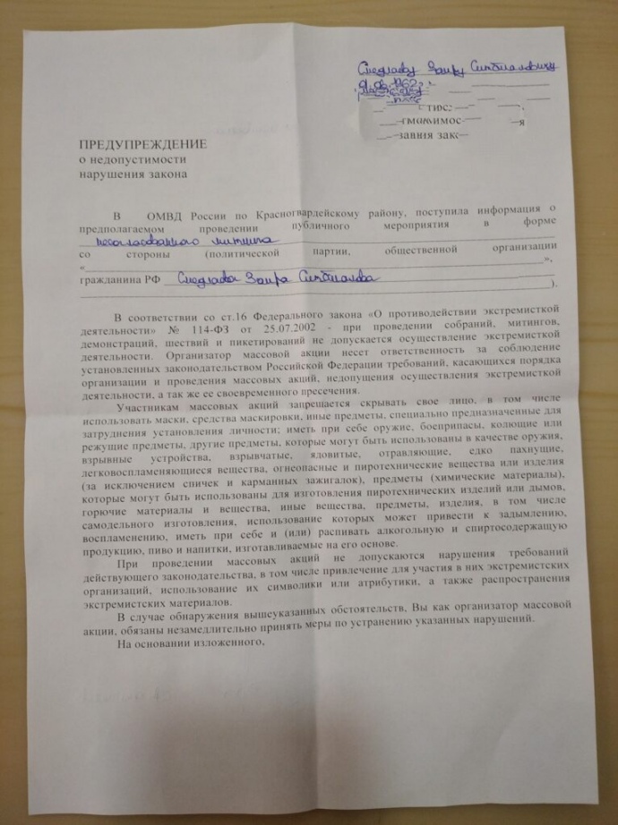 У "застереженні", підписаному заступником начальника "поліції МВС РФ по Червоногвардійському району", повідомляється, що на території Криму "планується проведення неузгодженого мітингу".