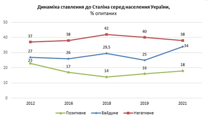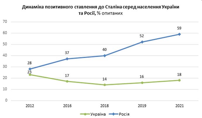Українці ставляться до Сталіна набагато гірше, ніж росіяни (громадяни Росії), і ця тенденція закріплюється. У 2021 році серед українців 18% позитивно ставляться до Сталіна, тоді як серед росіян – 59%.