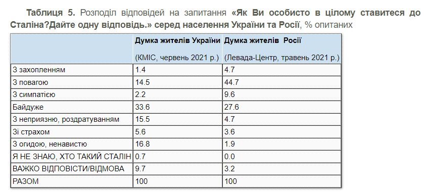 У Росії 45% опитаних ставляться до Сталіна з повагою, тоді як в Україні ця частка складає 15%. В Україні 17% респондентів ставляться до Сталіна з ненавистю і 15% з неприязню, а в Росії – лише 2% та 5% відповідно.