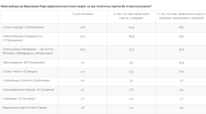 Партію "Сила і честь" готові підтримати відповідно 4% і 6% респондентів, партію "Українська стратегія Гройсмана" — 2% і 4%, партію "Громадянська позиція" — 2% і 3%, ВО "Свобода" — відповідно 2% і 3%.