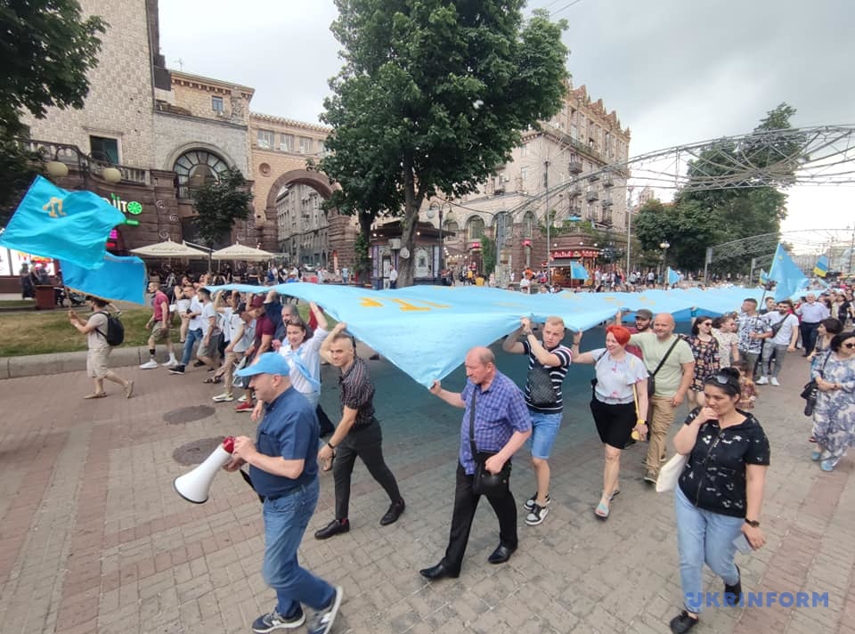 Деталі: Учасники акції несуть вулицею великий кримськотатарський прапор. У ході бере участь голова Меджлісу кримськотатарського народу Рефат Чубаров. На чолі колони учасники тримають український прапор разом із кримськотатарським.