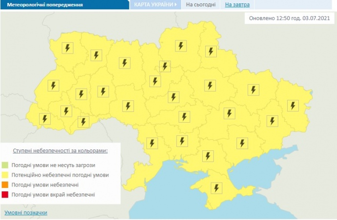 Дослівно: "Вдень 3 липня в Україні грози, в окремих районах град та шквали 15-20 м/с (І рівень небезпечності, жовтий).