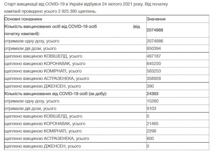 Загалом із 24 лютого проведено 2 925 380 щеплень.