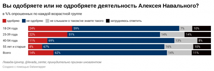 Найбільше діяльність Навального схвалюють респонденти 18-24 років: 24% схвалюють, 59% - не схвалюють. Найменше - респонденти 55 років і старше: 8% схвалюють, 67% не схвалюють.