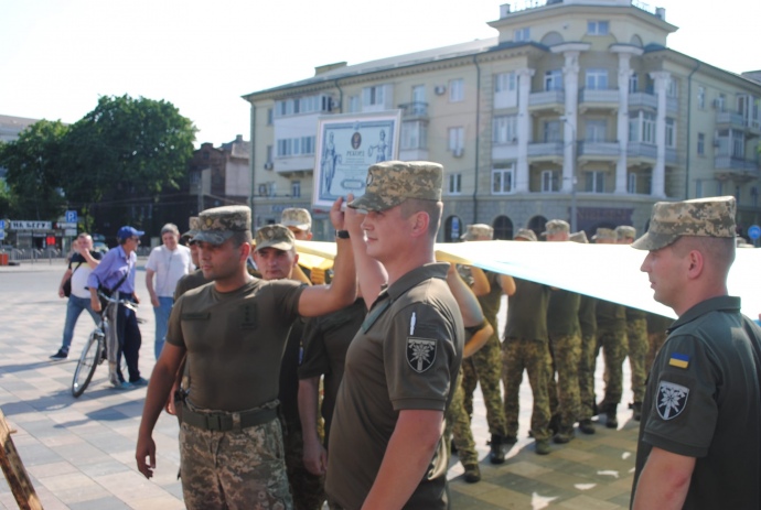 У центрі Маріуполя в неділю бійці Закарпатського легіону встановили рекорд України з найбільшої кількості військовослужбовців, які розгорнули Державний прапор України.